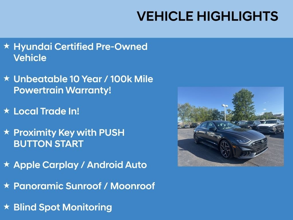 Hyundai Certified Pre-Owned Vehicle, Unbeatable 10 Year / 100k Mile Powertrain Warranty!, Local Trade In!, Proximity Key with PUSH BUTTON START, Apple Carplay / Android Auto, Panoramic Sunroof / Moonroof, Blind Spot Monitoring, Front Collision Avoidance, Lane Keep Assist, Rearview Camera, Hyundai Certified Used Vehicles Certified, Black Leather, 12 Speakers, 4-Wheel Disc Brakes, ABS brakes, Air Conditioning, Alloy wheels, AM/FM radio: SiriusXM, Apple CarPlay & Android Auto, Auto High-beam Headlights, Auto-dimming Rear-View mirror, Automatic temperature control, Bose Premium Audio, Brake assist, Bumpers: body-color, Cargo Net, Carpeted Floor Mats, Delay-off headlights, Driver door bin, Driver vanity mirror, Dual front impact airbags, Dual front side impact airbags, Electronic Stability Control, Emergency communication system: Blue Link Connected Car Service (3-year complimentary subscription), Exterior Parking Camera Rear, Four wheel independent suspension, Front anti-roll bar, Front Bucket Seats, Front Center Armrest, Front dual zone A/C, Front reading lights, Fully automatic headlights, Garage door transmitter: HomeLink, Heated door mirrors, Heated front seats, Heated N Unique Sport Seats, Illuminated entry, Knee airbag, Low tire pressure warning, Nappa Leather/Dinamica Seating Surfaces, Navigation System, Occupant sensing airbag, Option Group 01, Outside temperature display, Overhead airbag, Overhead console, Panic alarm, Passenger door bin, Passenger vanity mirror, Power door mirrors, Power driver seat, Power moonroof, Power steering, Power windows, Radio data system, Radio: AM/FM/MP3/HD/SiriusXM Display Audio w/Nav, Rear anti-roll bar, Rear seat center armrest, Rear side impact airbag, Rear window defroster, Remote keyless entry, Reversible Cargo Tray, Security system, Speed control, Speed-sensing steering, Speed-Sensitive Wipers, Split folding rear seat, Spoiler, Steering wheel mounted audio controls, Tachometer, Telescoping steering wheel, Tilt steering wheel, Traction control, Trip computer, Turn signal indicator mirrors, Variably intermittent wipers, Wheels: N Unique 19" Alloy, Wireless Device Charging, Smart Cruise, Premium Bose Audio System, 2 Sets of Keys!, Black Leather. Hyundai Sonata 2021 Portofino Gray N Line Certified. Hyundai Certified Used Vehicles Details: