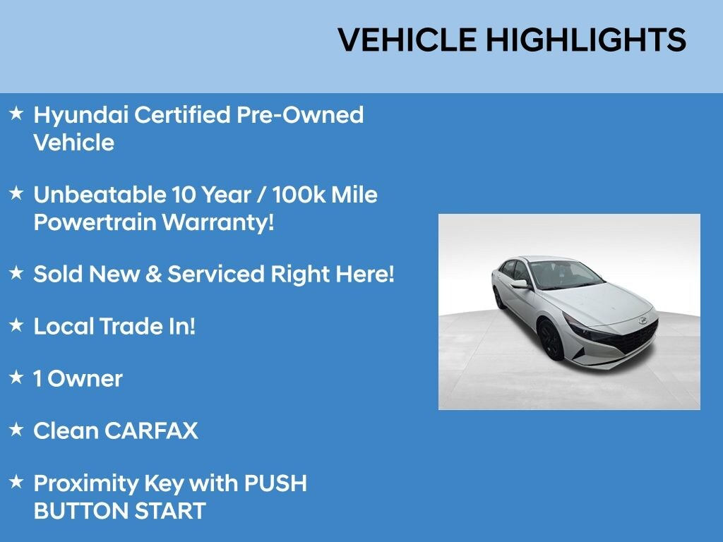 Hyundai Certified Pre-Owned Vehicle, Unbeatable 10 Year / 100k Mile Powertrain Warranty!, Sold New & Serviced Right Here!, Local Trade In!, 1 Owner, Clean CARFAX, Proximity Key with PUSH BUTTON START, Apple Carplay / Android Auto, Blind Spot Monitoring, Front Collision Avoidance, Lane Keep Assist, Rearview Camera, Blue Link Ready!, 2 Sets of Keys!. Hyundai Elantra 2023 Serenity White Pearl SEL Certified. Hyundai Certified Used Vehicles Details: