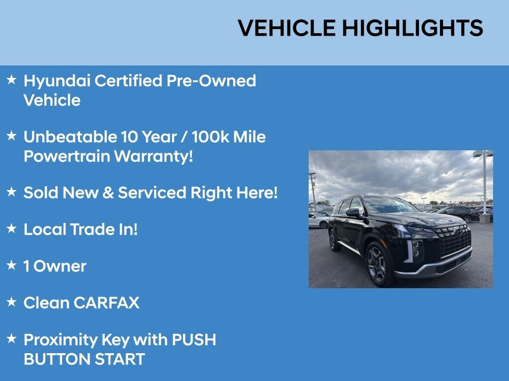 Hyundai Certified Pre-Owned Vehicle, Unbeatable 10 Year / 100k Mile Powertrain Warranty!, Sold New & Serviced Right Here!, Local Trade In!, 1 Owner, Clean CARFAX, Proximity Key with PUSH BUTTON START, Apple Carplay / Android Auto, Leather / Leatherette Seating, Heated and Ventilated Front Seats, Heated and Ventilated Rear Seats, Blind Spot Monitoring, Front Collision Avoidance, Lane Keep Assist, Rearview Camera, Surround View Camera, Power Liftgate, Blue Link Ready!, 2 Sets of Keys!, Wireless Charging Pad, 2nd Row Captains Chairs, Third Row Seating, 20" Alloy Wheels, Harman Kardon Premium Audio. Hyundai Palisade 2023 Abyss Black Pearl SEL Certified. Hyundai Certified Used Vehicles Details: