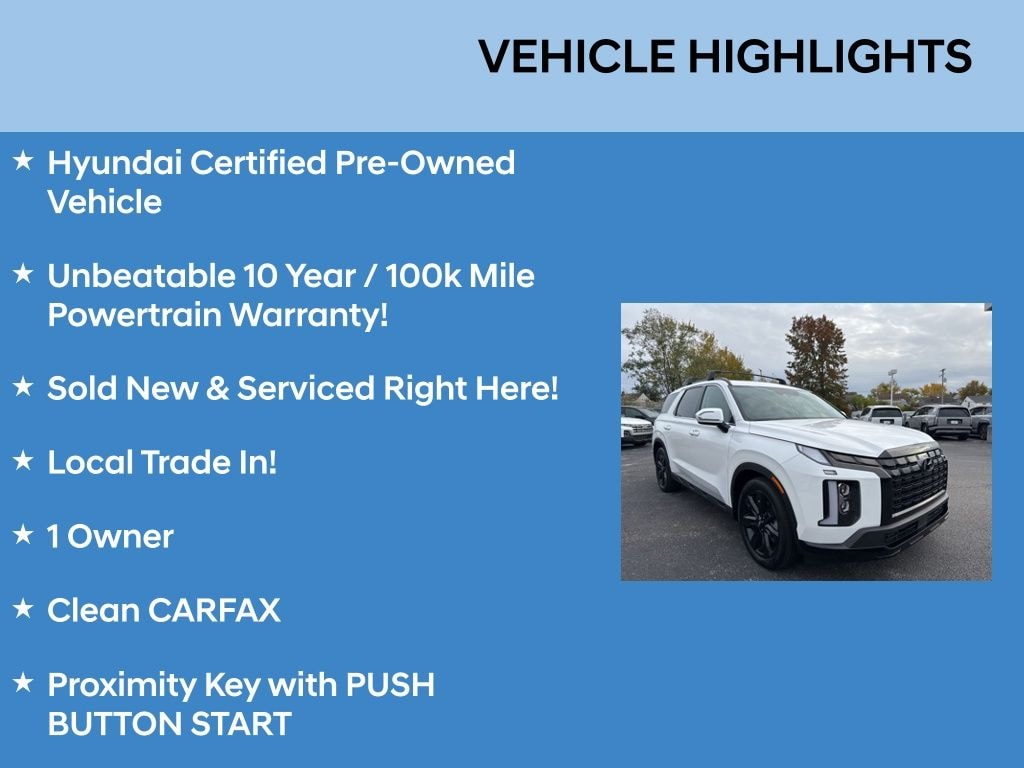 Hyundai Certified Pre-Owned Vehicle, Unbeatable 10 Year / 100k Mile Powertrain Warranty!, Sold New & Serviced Right Here!, Local Trade In!, 1 Owner, Clean CARFAX, Proximity Key with PUSH BUTTON START, Apple Carplay / Android Auto, Power Sunroof / Moonroof, Leather / Leatherette Seating, Heated Front Seats, Blind Spot Monitoring, Front Collision Avoidance, Lane Keep Assist, Rearview Camera, Hyundai Certified Used Vehicles Certified, 3.648 Axle Ratio, 3rd row seats: split-bench, 4-Wheel Disc Brakes, 6 Speakers, ABS brakes, Air Conditioning, Alloy wheels, AM/FM radio: SiriusXM, Apple CarPlay & Android Auto, Auto High-beam Headlights, Auto-dimming door mirrors, Auto-dimming Rear-View mirror, Auto-leveling suspension, Automatic temperature control, Brake assist, Bumpers: body-color, Cargo Cover/Screen, Carpeted Floor Mats, Delay-off headlights, Driver door bin, Driver vanity mirror, Dual front impact airbags, Dual front side impact airbags, Electronic Stability Control, Emergency communication system: Blue Link Connected Car Service (3-year complimentary subscription), Exterior Parking Camera Rear, First Aid Kit, Four wheel independent suspension, Front anti-roll bar, Front Bucket Seats, Front Center Armrest, Front dual zone A/C, Front reading lights, Fully automatic headlights, Garage door transmitter: HomeLink, H-Tex Leatherette Seat Trim, Heated door mirrors, Heated Front Bucket Seats, Heated front seats, Illuminated entry, Knee airbag, Low tire pressure warning, Navigation System, Occupant sensing airbag, Option Group 01, Outside temperature display, Overhead airbag, Overhead console, Panic alarm, Passenger door bin, Passenger vanity mirror, Power door mirrors, Power driver seat, Power Liftgate, Power moonroof, Power passenger seat, Power steering, Power windows, Radio data system, Radio: AM/FM/MP3 Audio System, Rear air conditioning, Rear anti-roll bar, Rear audio controls, Rear Bumper Applique, Rear reading lights, Rear side impact airbag, Rear window defroster, Rear window wiper, Reclining 3rd row seat, Remote keyless entry, Security system, Speed control, Speed-sensing steering, Splash Trim, Split folding rear seat, Spoiler, Steering wheel mounted audio controls, Tachometer, Telescoping steering wheel, Tilt steering wheel, Traction control, Trip computer, Turn signal indicator mirrors, Variably intermittent wipers, Wheels: 20" x 7.5J Dark Alloy w/Rugged Styling, Power Liftgate, Smart Cruise, Blue Link Ready!, 2 Sets of Keys!, Wireless Charging Pad, Highway Drive Assist, Power Front Seats, 2nd Row Captains Chairs, Third Row Seating. Hyundai Palisade 2023 Hyper White XRT Certified. Hyundai Certified Used Vehicles Details: