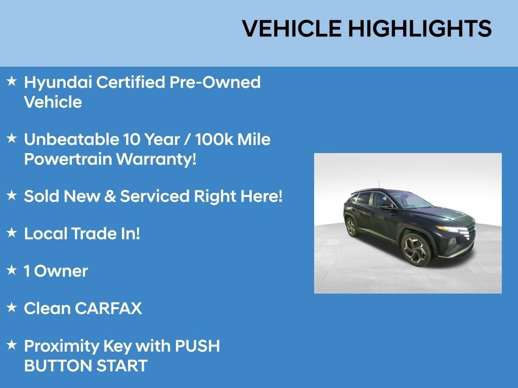 Hyundai Certified Pre-Owned Vehicle, Unbeatable 10 Year / 100k Mile Powertrain Warranty!, Sold New & Serviced Right Here!, Local Trade In!, 1 Owner, Clean CARFAX, Proximity Key with PUSH BUTTON START, Apple Carplay / Android Auto, Power Sunroof / Moonroof, Leather / Leatherette Seating, Heated Front Seats, Blind Spot Monitoring, Front Collision Avoidance, Lane Keep Assist, Rearview Camera, Convenience Package!, 2 Sets of Keys!, 10.25" Display, AWD. Hyundai Tucson 2023 Phantom Black SEL Certified. Hyundai Certified Used Vehicles Details: