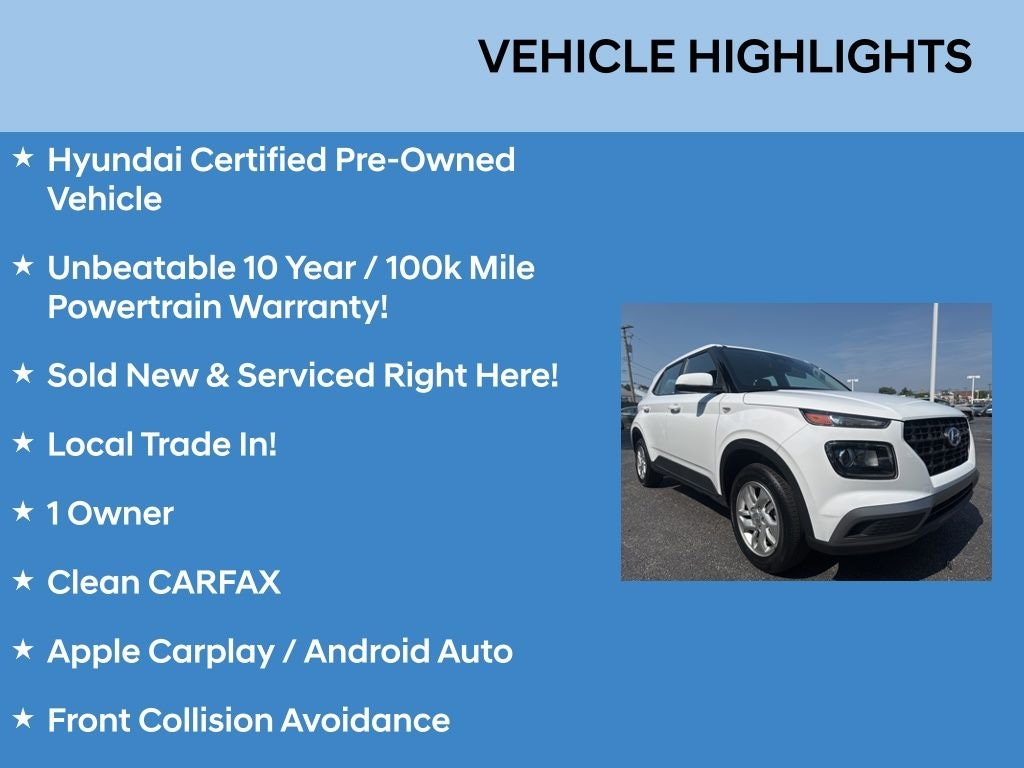 Hyundai Certified Pre-Owned Vehicle, Unbeatable 10 Year / 100k Mile Powertrain Warranty!, Sold New & Serviced Right Here!, Local Trade In!, 1 Owner, Clean CARFAX, Apple Carplay / Android Auto, Front Collision Avoidance, Lane Keep Assist, Rearview Camera, Hyundai Certified Used Vehicles Certified, 4 Speakers, 6.052 Axle Ratio, ABS brakes, Air Conditioning, Alloy wheels, AM/FM radio, Apple CarPlay & Android Auto, Auto High-beam Headlights, Brake assist, Bumpers: body-color, Cargo Blocks, Cargo Net, Cargo Package, Cargo Tray, Carpeted Floor Mats, Cloth Seat Trim, Delay-off headlights, Driver door bin, Driver vanity mirror, Dual front impact airbags, Dual front side impact airbags, Electronic Stability Control, First Aid Kit, Front anti-roll bar, Front Bucket Seats, Front Center Armrest, Front reading lights, Front wheel independent suspension, Fully automatic headlights, Illuminated entry, Low tire pressure warning, Occupant sensing airbag, Option Group 01, Outside temperature display, Overhead airbag, Overhead console, Panic alarm, Passenger door bin, Passenger vanity mirror, Power door mirrors, Power steering, Power windows, Radio: AM/FM/HD Display Audio, Rear Seat Cup Holder, Rear window defroster, Rear window wiper, Remote keyless entry, Security system, Speed control, Speed-sensing steering, Split folding rear seat, Spoiler, Steering wheel mounted audio controls, Tachometer, Telescoping steering wheel, Tilt steering wheel, Traction control, Trip computer, Variably intermittent wipers, Wheels: 6.0J x 15" Alloy, 2 Sets of Keys!. Hyundai Venue 2023 Ceramic White SE Certified. Hyundai Certified Used Vehicles Details: