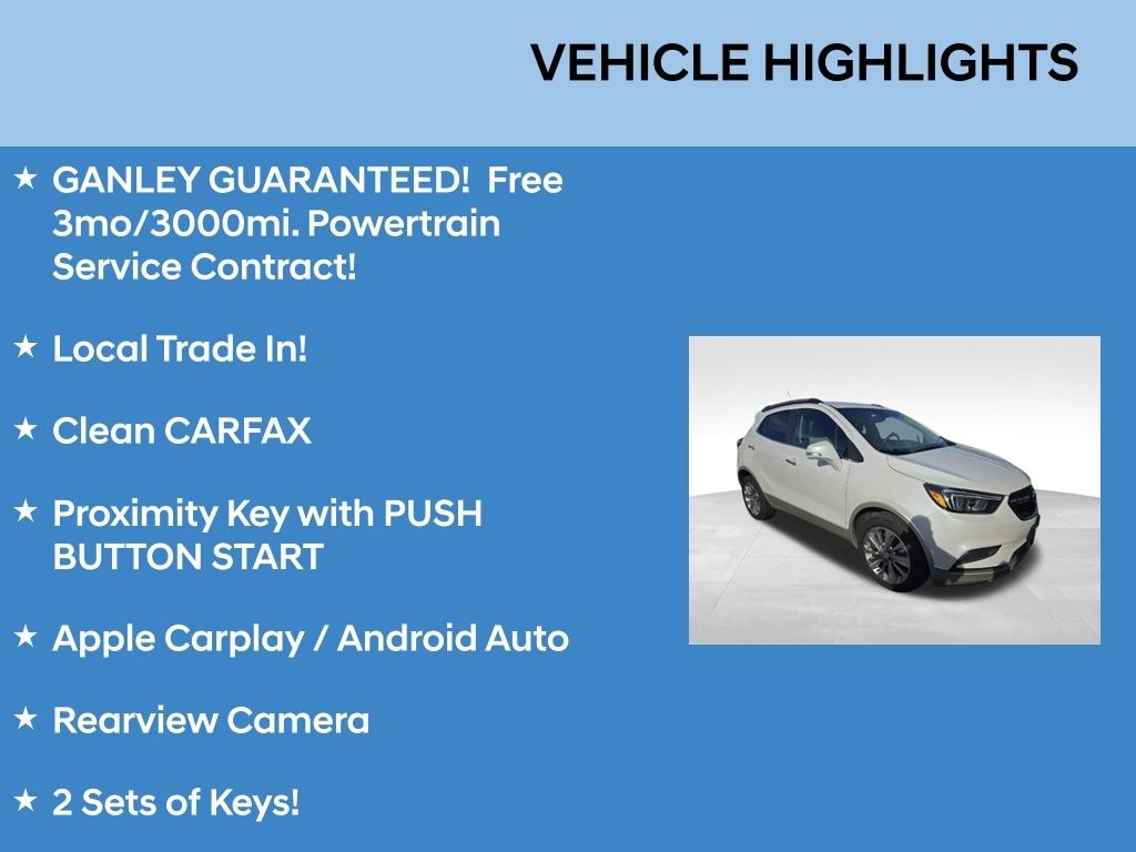 GANLEY GUARANTEED! Free 3mo/3000mi. Powertrain Service Contract!, Local Trade In!, Clean CARFAX, Proximity Key with PUSH BUTTON START, Apple Carplay / Android Auto, Rearview Camera, 2-Way Manual Front Passenger Seat Adjuster, 3.53 Final Drive Axle Ratio, 4-Wheel Disc Brakes, 6 Speakers, 6-Way Power Driver Seat Adjuster, ABS brakes, Air Conditioning, Alloy wheels, AM/FM radio: SiriusXM, Apple CarPlay/Android Auto, Brake assist, Bumpers: body-color, Cloth w/Leatherette Seat Trim, Compass, Delay-off headlights, Driver door bin, Driver vanity mirror, Driver's Seat Mounted Armrest, Dual front impact airbags, Dual front side impact airbags, Electronic Stability Control, Emergency communication system: OnStar Guidance, Exterior Parking Camera Rear, Front anti-roll bar, Front Bucket Seats, Front License Plate Bracket, Front reading lights, Front wheel independent suspension, Fully automatic headlights, Heated door mirrors, Illuminated entry, Knee airbag, Low tire pressure warning, Occupant sensing airbag, Outside temperature display, Overhead airbag, Panic alarm, Passenger door bin, Passenger vanity mirror, Power door mirrors, Power driver seat, Power steering, Power windows, Preferred Equipment Group 1SB, Premium audio system: IntelliLink, Radio data system, Radio: Buick IntelliLink AM/FM Stereo, Rear seat center armrest, Rear side impact airbag, Rear window defroster, Rear window wiper, Remote keyless entry, Ride & Handling Suspension, Roof rack: rails only, Satin Nickel Metallic Lower Exterior Accent Color, Security system, SiriusXM Satellite Radio, Speed control, Speed-sensing steering, Split folding rear seat, Spoiler, Steering wheel mounted audio controls, Tachometer, Telescoping steering wheel, Tilt steering wheel, Traction control, Trip computer, Turn signal indicator mirrors, Variably intermittent wipers, Wheels: 18" Machined-Face Alloy, 2 Sets of Keys!. Buick Encore 2017 White Frost Tricoat Preferred Clean CARFAX.