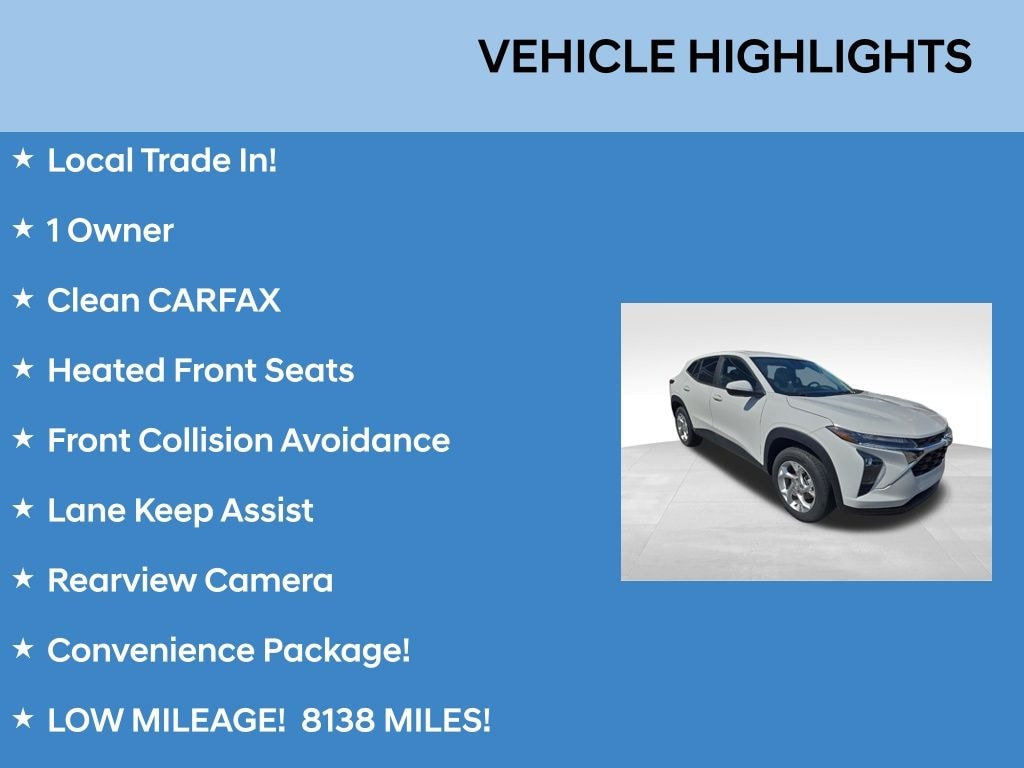 Local Trade In!, 1 Owner, Clean CARFAX, Heated Front Seats, Front Collision Avoidance, Lane Keep Assist, Rearview Camera, Convenience Package!, LOW MILEAGE! 8138 MILES!, 17" Wheels, Heated Power Side Mirrors. Chevrolet Trax 2024 Summit White LS CARFAX One-Owner. Clean CARFAX.