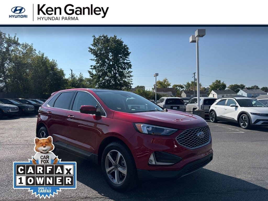 Local Trade In!, 1 Owner, Clean CARFAX, Proximity Key with PUSH BUTTON START, Apple Carplay / Android Auto, Panoramic Sunroof / Moonroof, Leather / Leatherette Seating, Heated Front Seats, Blind Spot Monitoring, Front Collision Avoidance, Lane Keep Assist, Rearview Camera, Surround View Camera, AWD, 110V/150W AC Power Outlet, 3.80 Axle Ratio, 4-Wheel Disc Brakes, 6 Speakers, ABS brakes, ActiveX Seating Material Heated Bucket Seats, Air Conditioning, Alloy wheels, AM/FM radio: SiriusXM with 360L, Auto High-beam Headlights, Auto-dimming Rear-View mirror, Automatic temperature control, Brake assist, Bumpers: body-color, Compass, Convenience Package, Delay-off headlights, Driver door bin, Driver vanity mirror, Dual front impact airbags, Dual front side impact airbags, Electronic Stability Control, Emergency communication system: SYNC 4 911 Assist, Equipment Group 201A, Fog Lamps w/Iconic Silver Bezel, FordPass Connect, Four wheel independent suspension, Front anti-roll bar, Front Bucket Seats, Front Center Armrest w/Storage, Front dual zone A/C, Front reading lights, Fully automatic headlights, Heated door mirrors, Heated front seats, Heated Steering Wheel, Illuminated entry, Knee airbag, Leather steering wheel, Leather-Wrapped Steering Wheel, Low tire pressure warning, Occupant sensing airbag, Outside temperature display, Overhead airbag, Overhead console, Panic alarm, Panoramic Vista Roof, Passenger door bin, Passenger vanity mirror, Perimeter Alarm, Power door mirrors, Power driver seat, Power Liftgate, Power passenger seat, Power steering, Power windows, Radio: AM/FM Stereo/MP3 Capable, Rear anti-roll bar, Rear Parking Sensors, Rear reading lights, Rear seat center armrest, Rear window defroster, Rear window wiper, Remote keyless entry, Remote Start System, SiriusXM w/360L, Speed control, Speed-Sensitive Wipers, Split folding rear seat, Spoiler, Steering wheel mounted audio controls, SYNC 4A w/Enhanced Voice Recognition, Tachometer, Telescoping steering wheel, Tilt steering wheel, Traction control, Trip computer, Universal Garage Door Opener (UGDO), Variably intermittent wipers, Wheels: 18" Bright-Machined Aluminum, Wheels: 18" Sparkle Silver-Painted Aluminum, Wireless Charging Pad, Power Liftgate, Remote Start, 2 Sets of Keys!, Wireless Charging Pad, LOW MILEAGE! Only 15998 Miles!, Ford Co-Pilot 360!, Homelink, AWD. Ford Edge 2023 Rapid Red Metallic Tinted Clearcoat SEL CARFAX One-Owner. Clean CARFAX. Odometer is 21048 miles below market average!
