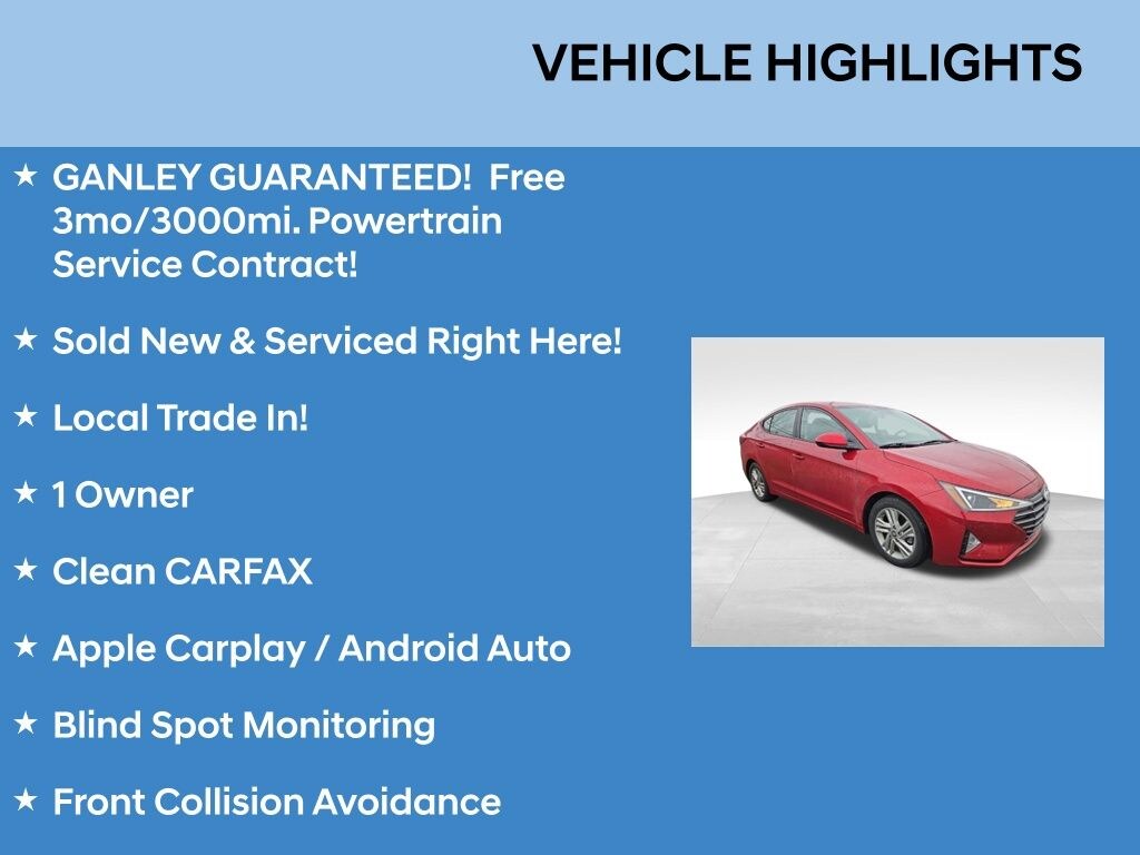 GANLEY GUARANTEED! Free 3mo/3000mi. Powertrain Service Contract!, Sold New & Serviced Right Here!, Local Trade In!, 1 Owner, Clean CARFAX, Apple Carplay / Android Auto, Blind Spot Monitoring, Front Collision Avoidance, Lane Keep Assist, Rearview Camera, Convenience Package!, 2 Sets of Keys!. Hyundai Elantra 2020 Scarlet Red Pearl SEL CARFAX One-Owner. Clean CARFAX.