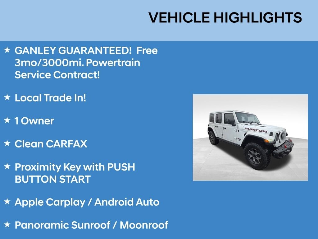 GANLEY GUARANTEED! Free 3mo/3000mi. Powertrain Service Contract!, Local Trade In!, 1 Owner, Clean CARFAX, Proximity Key with PUSH BUTTON START, Apple Carplay / Android Auto, Panoramic Sunroof / Moonroof, GPS Navigation, Leather Interior, Heated Front Seats, Blind Spot Monitoring, Front Collision Avoidance, Lane Keep Assist, Rearview Camera, 2 Sets of Keys!, OVER $20K IN OPTIONAL EQUIPMENT!!, Sky One Touch Power Top!, Leather Group, Trailer Tow Group, Premium Audio Group, Safety Group, Advanced Safety Group, Steep Bumper Group. Jeep Wrangler 2021 Bright White Clearcoat Unlimited Rubicon Clean CARFAX.