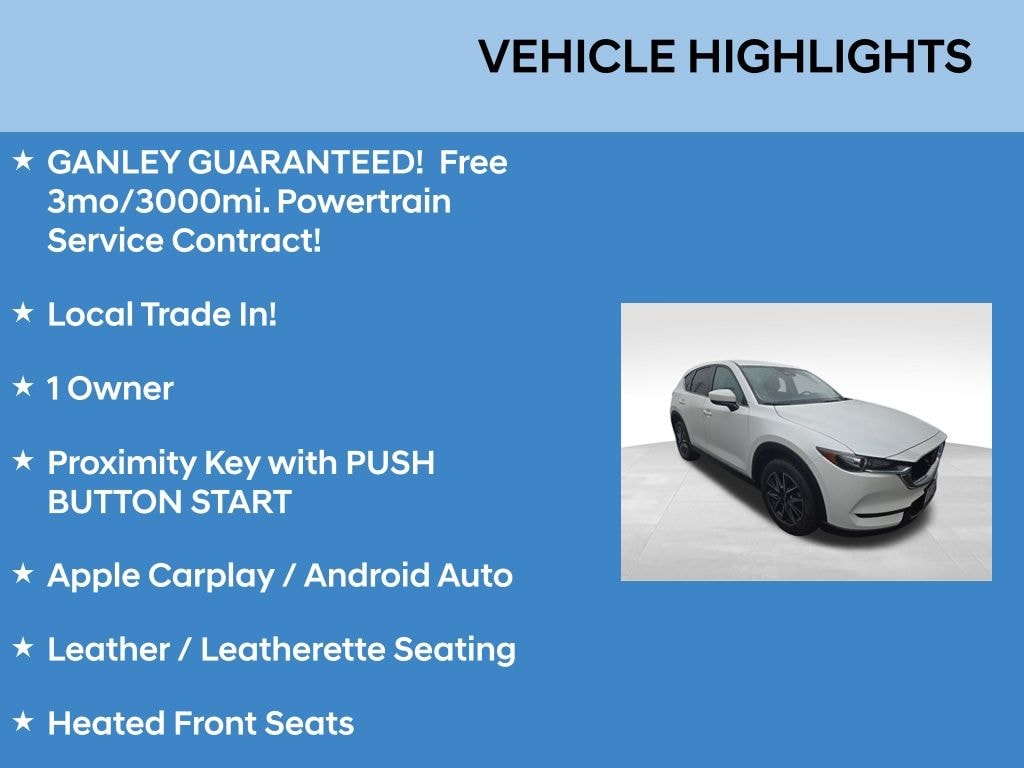 GANLEY GUARANTEED! Free 3mo/3000mi. Powertrain Service Contract!, Local Trade In!, 1 Owner, Proximity Key with PUSH BUTTON START, Apple Carplay / Android Auto, Leather / Leatherette Seating, Heated Front Seats, Blind Spot Monitoring, Front Collision Avoidance, Lane Keep Assist, Rearview Camera, 2 Sets of Keys!. Mazda CX-5 2018 Snowflake White Pearl Mica Touring CARFAX One-Owner.